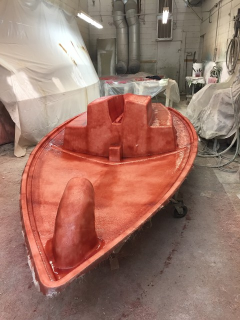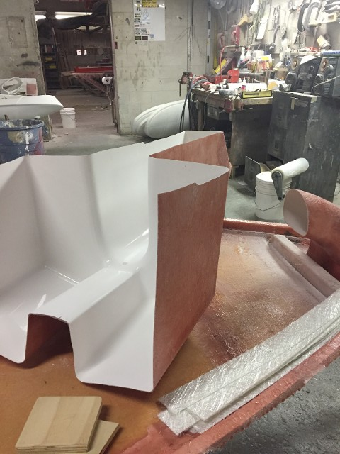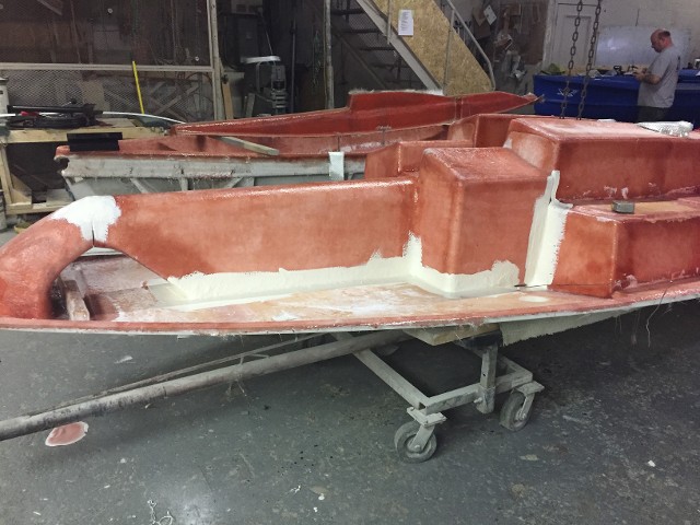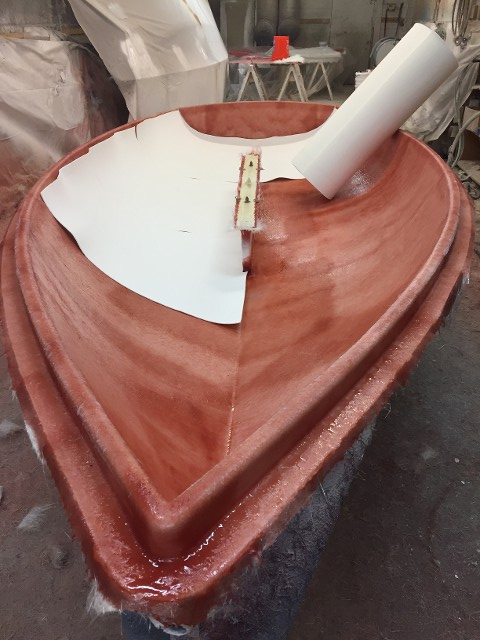 The Deck Mold – To this point it has been Gelcoated 18-20 mills in thickness and allowed to kick off. Handlay has been applied around those areas that are easy for voids to appear. The whole outside edge of the deck and down into the trunk. A layer of chop strand has been chopped and rolled out carefully. Next will come a closed-cell foam for strength as well as flotation, chop will again be applied and allowed to cure overnight before taking it out of the mold.