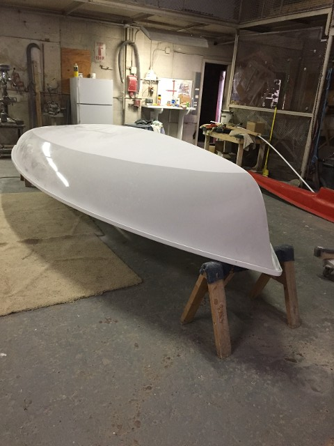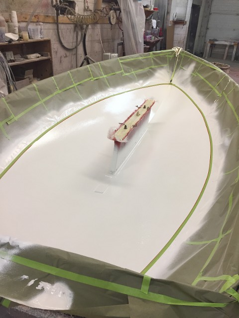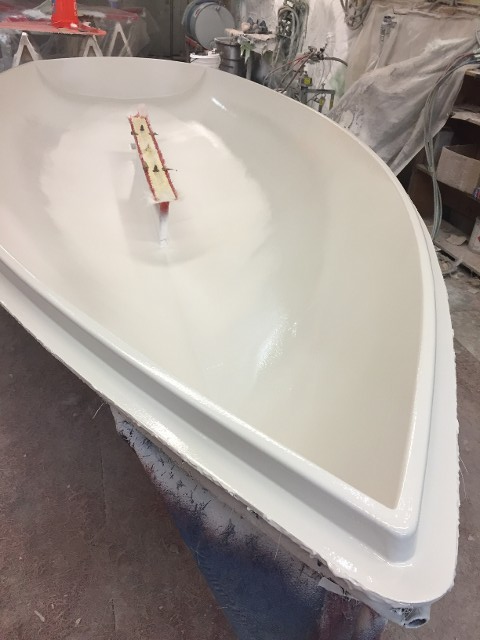 The grey has been sprayed to complete the gelcoat process. This will cure and handlay will be applied around the top edge and around the centerboard slot (no leaky seams).