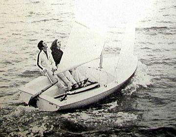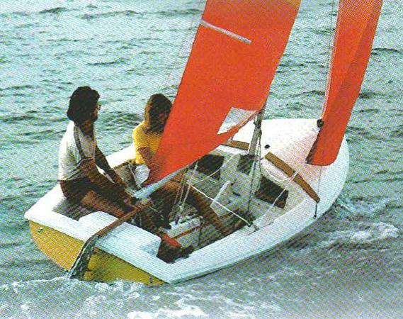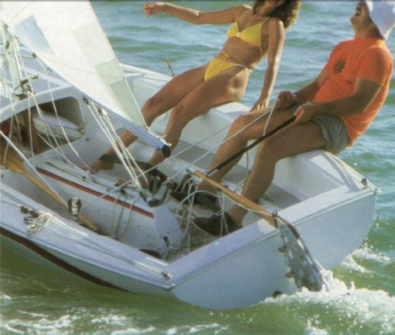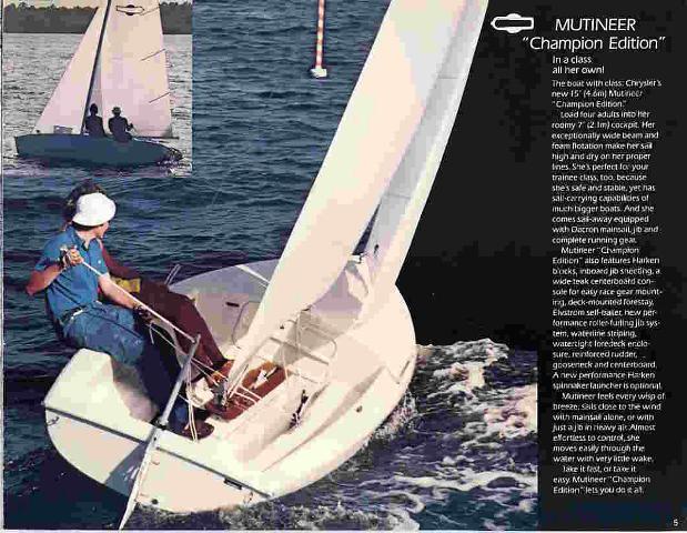 The mahogany rudderhead was soon changed to the cast aluminum rudderhead. The original model had a large opening in the bulkhead to access the entire forward hull space with a removable fiberglass cover, jib tracks on the gunwale, a centerboard trunk cap that was riveted onto the lower half of the fiberglass trunk, with 2 narrow trim pieces of teak on top. The earliest marketing photos (sail #17 in a 1971/1972 Chrysler ad) shows the Mutineer with a fabric or vinyl flap ostensibly covering the launching snout in front of the jib tack, and photos in the 1972/1973 ads show the boat sailing with a spinnaker.  Early 1971 ad.
