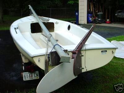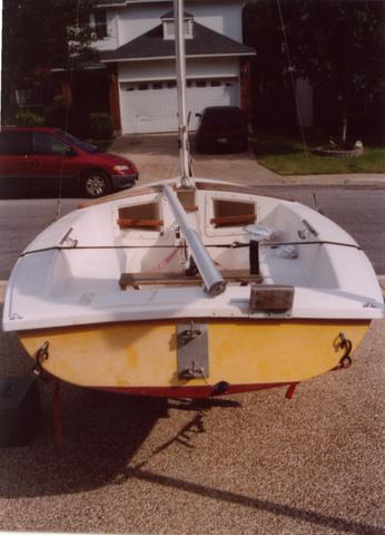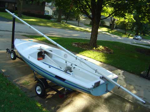 Hull outfitted with rigging and cap installed. Ready for lines and water. Summary of Changes | 1971 – Chrysler Base price $1,700 Mahogany rudderhead replaced with cast aluminum | 1974 Base price $2,080 | 1977 Base price $2,045 Lime hull color introduced | 1979 Base price $2,415 Harken blocks replace Fico blocks Inboard jib sheeting Wide, teak centerboard console Wire luff roller furling Elvstrom self-bailers Reinforced rudder and centerboard Sealed cuddy Aluminum bridge to reinforce centerboard trunk cover and mainsheet block Bow u-bolt moved from deck to cutwater Teak mast support post Cooler holder, aft cockpit | 1980 Colorful sails and hulls | 1980 – TMI No major changes | 1982 – Wellcraft Kenyon spars introduced Fixed goosneck in place of the sliding gooseneck Champion’s model introduced which included: Low windage spars with internal haryards Harken hardware to include spinnaker blocks and 5:1 boom vang Telescoping hiking stick Spinnaker snout, pole, halyard and uphaul/downhaul Two large Elvstrom bailers Individual hiking straps for the skipper and crew Harken magic box jib tensioner Cunningham | 1983 Centerboard trunk becomes integral to mold eliminating the centerboard trunk cover Centerboard pivot pin replaced pivot plates Single large cuddy changed to two small cuddies Recessed and reinforced mast step Gunwale redesigned, deck lip rolled over hull lip, Shoe Box Hull Deck Joint Chainplates redesigned, moved to gunwale lip Aluminum plate rudderhead replaced the cast aluminum rudderhead Pintles moved from rudderhead to transom and gudgeons moved from transom to rudderhead Splash guards added to deck mold to which wood splash guards were attached Bevel for jib track moved from seats to gunwales Spinnaker sock moved from centerboard trunk to under starboard seat | 1984 Mast length increased to 22′ 6″ | 1985 – Gloucester Base price $2,995 Cuddy enlarged with two openings Dwyer spars replaced Kenyon spars Sliding goosenech intrduced Top mounted centerboard hangers replaced the centerboard bolt 3/32″ shrouds replaced 1/8″ shrouds No spinnaker snout External halyards Chainplates moved inboard and glassed into the hull – 5000 model No self-bailer – 5000 model Chainplates moved back to gunwale lip – 6000 model Single Holt Allen self-bailer located behind centerboard trunk – 6000 model | 1986 – Cardinal If any Mutineers were built under the Cardinal brand we expect no changes from Gloucester Mutineers | 2008 to 2016 – Nickels Boat Works