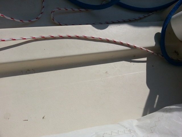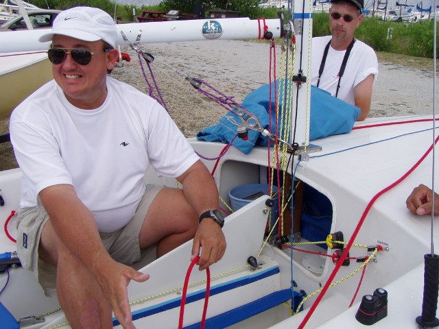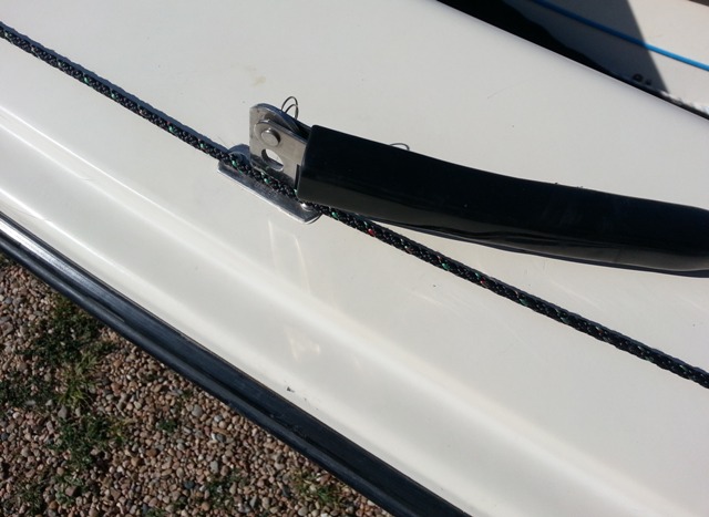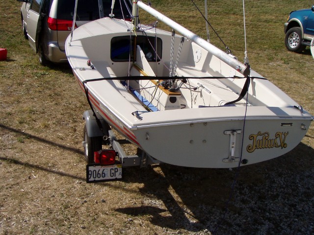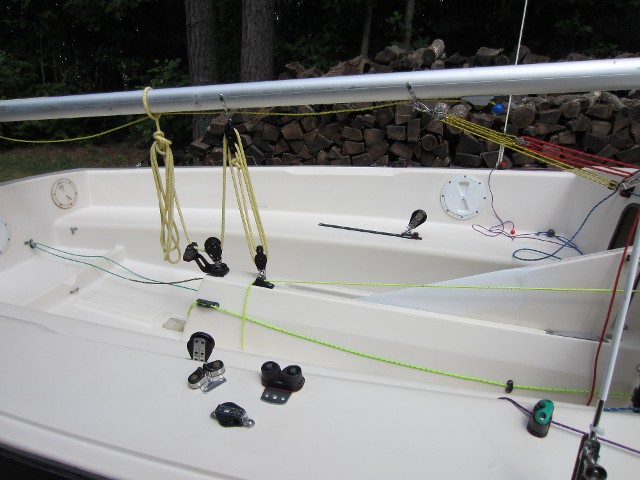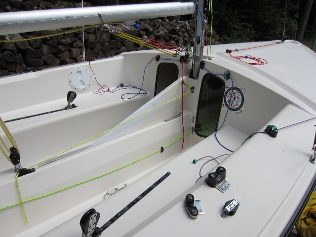 Another shot of the 1985 Gloucester. Notice the square directly behind the centerboard trunk. This is the location of the single Holt Allen bailer that came from the factory. It was removed and Elvstrom self-bailers were installed on both sides of the centerboard trunk. Gloucester also used a Harkin #58 fiddle block with becket and cam cleat for the main sheet. Under any load it was difficult to secure or release the mainsheet while sitting on a gunwale. It has been replaced with a Harkin #205 cam base which swivels without twisting the mainsheet.