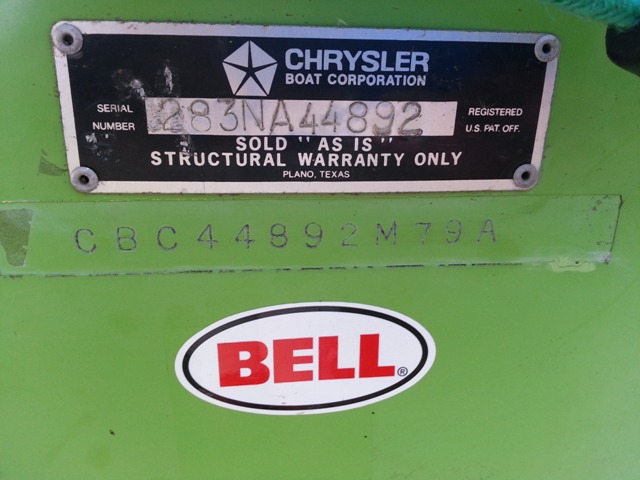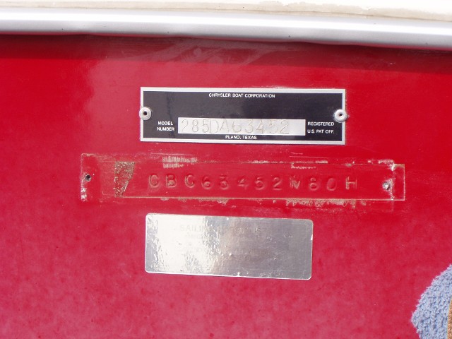 Charles Bell’s 1979 Mutineer has an open cuddy and none of the 1979 Championship Edition upgrades. The serial number shows Model 283. The HIN indicates a production date of August 1979 – A indicates August in the Model Year Format of the HIN. Notice the serial number plate states “SOLD “AS IS” STRUCTURAL WARRANTY ONLY” Why did Chrysler include this disclaimer? Did Chrysler know the open cuddy was subject to swamping and possible sinking?  Scott’s 1979 HIN indicates it was built in May 1980 and is Model 284.