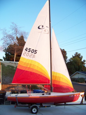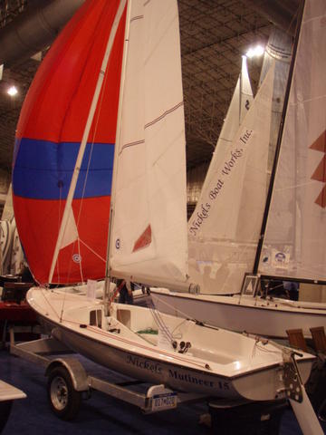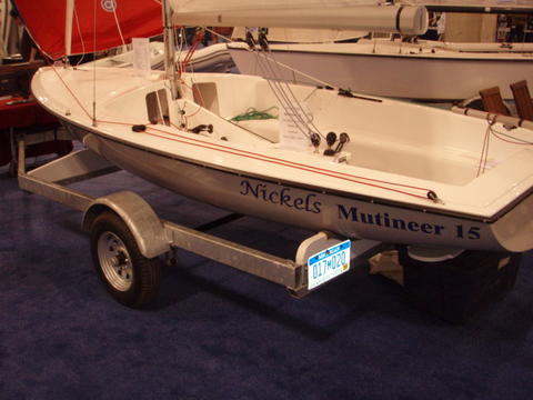 The first Nickels Mutineer, sail #8001, built with white deck and white hull, was displayed at the Strictly Sail boat show in Chicago January 31-February 3, 2008. It was sold to a family in the Midwest. The base price for a 2008 Nickels Mutineer was $9995 complete with main, jib, spinnaker and trailer. The second Nickels Mutineer was custom built for Gib Charles of Colorado in April 2008. As of February 2013 Nickels has sold 20 Mutineers.  The much improved 2008 Nickels Mutineer.