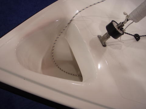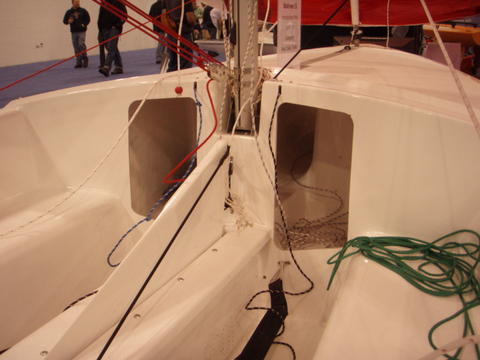 Enclosed cuddy, notice the fiberglass spinnaker tunnel. No more water between the hull and the cockpit liner.