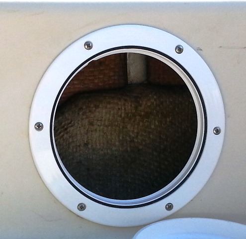 The chainplates on Greg’s Mutineer are inboard of the hull/deck joint. The chainplates were secured not with bolts, but rather by fiberglassing them into the hull. We speculate the bottom of the chainplates have some sort of hook for additional grip.  This picture shows the chainplate fiberglassed into the hull.
