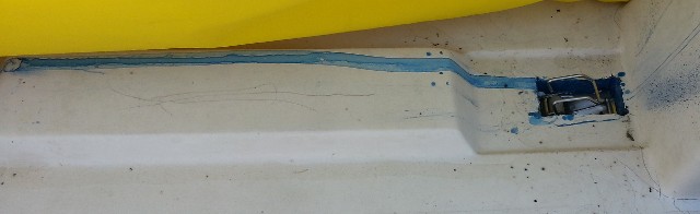 Greg’s early Gloucester had a ridge in the cockpit between the centerboard trunk and cooler holder. Perhaps the ridge facilitated the draining of the inner hull to the transom. A self-bailer was not installed on this model. Ricardo’s Gloucester HIN is GYI6027PC585 indicating the 6000 model built in May 1985. The chainplates were moved back to the deck/hull joint and a bailer was installed behind the centerboard trunk. Chainplates moved back to the hull/deck joint (wrong bolts used?).