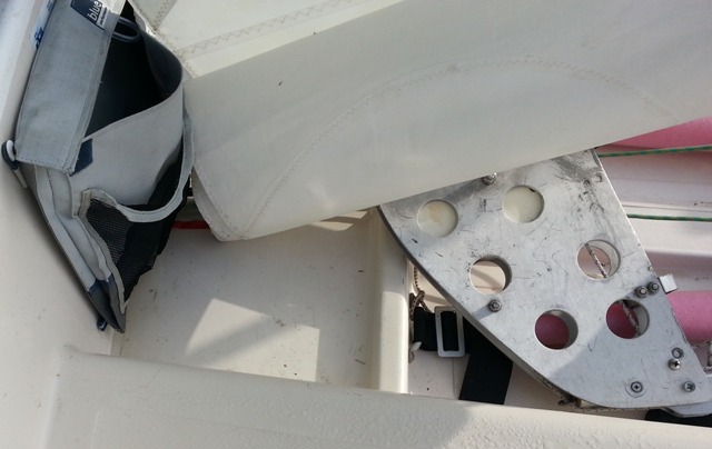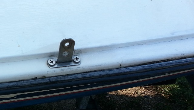 1979 Chrysler Mutineer with aluminum bridge. The aluminum bridge was added by Chrysler to strenghten the attachment point of the mainsheet block. The bridge transferred the pulling forces from the centerboard cover to the centerboard trunk.